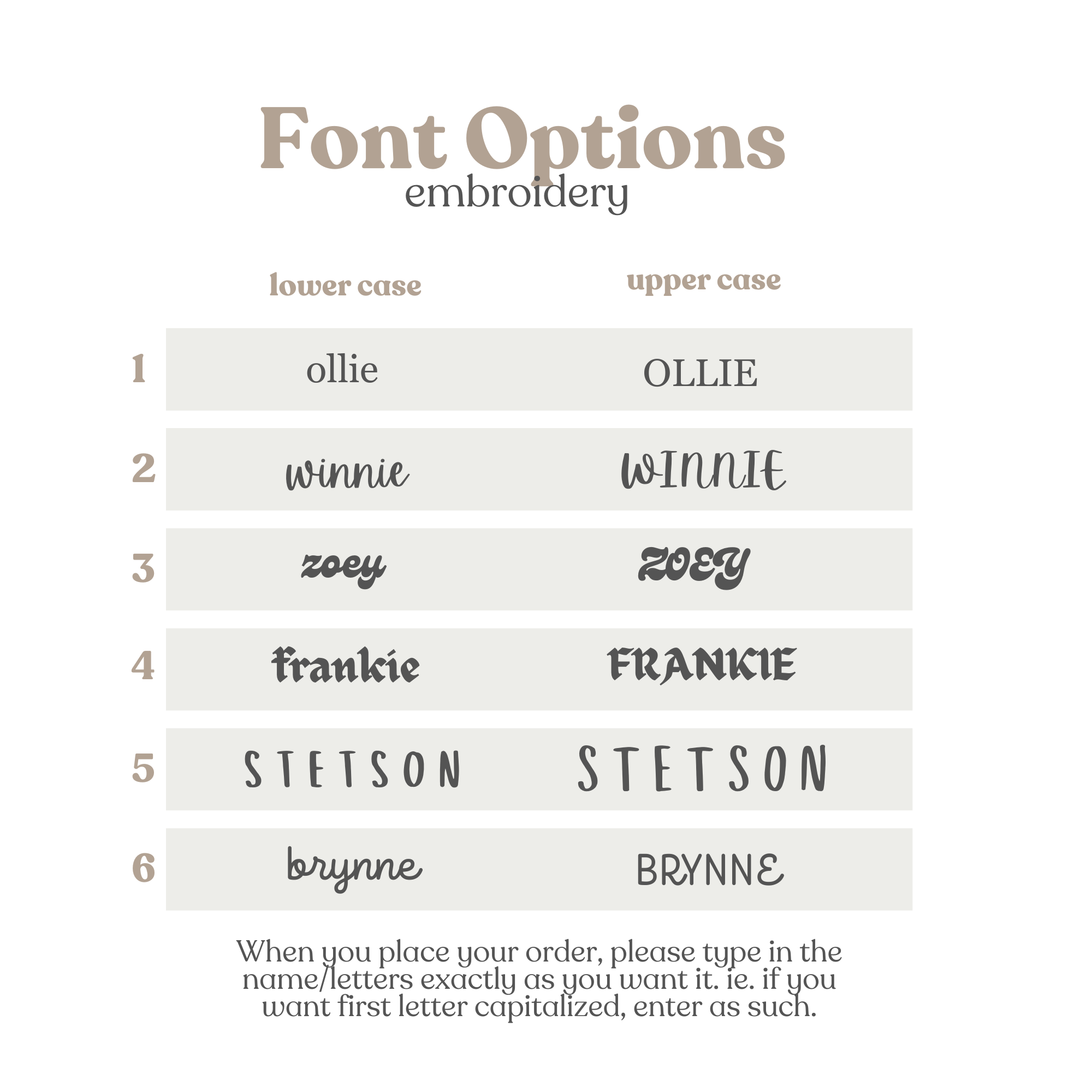 Many of our items have the option to have names added. There are 6 popular font options to choose from. You’ll be prompted to choose an option (if applicable) at checkout.